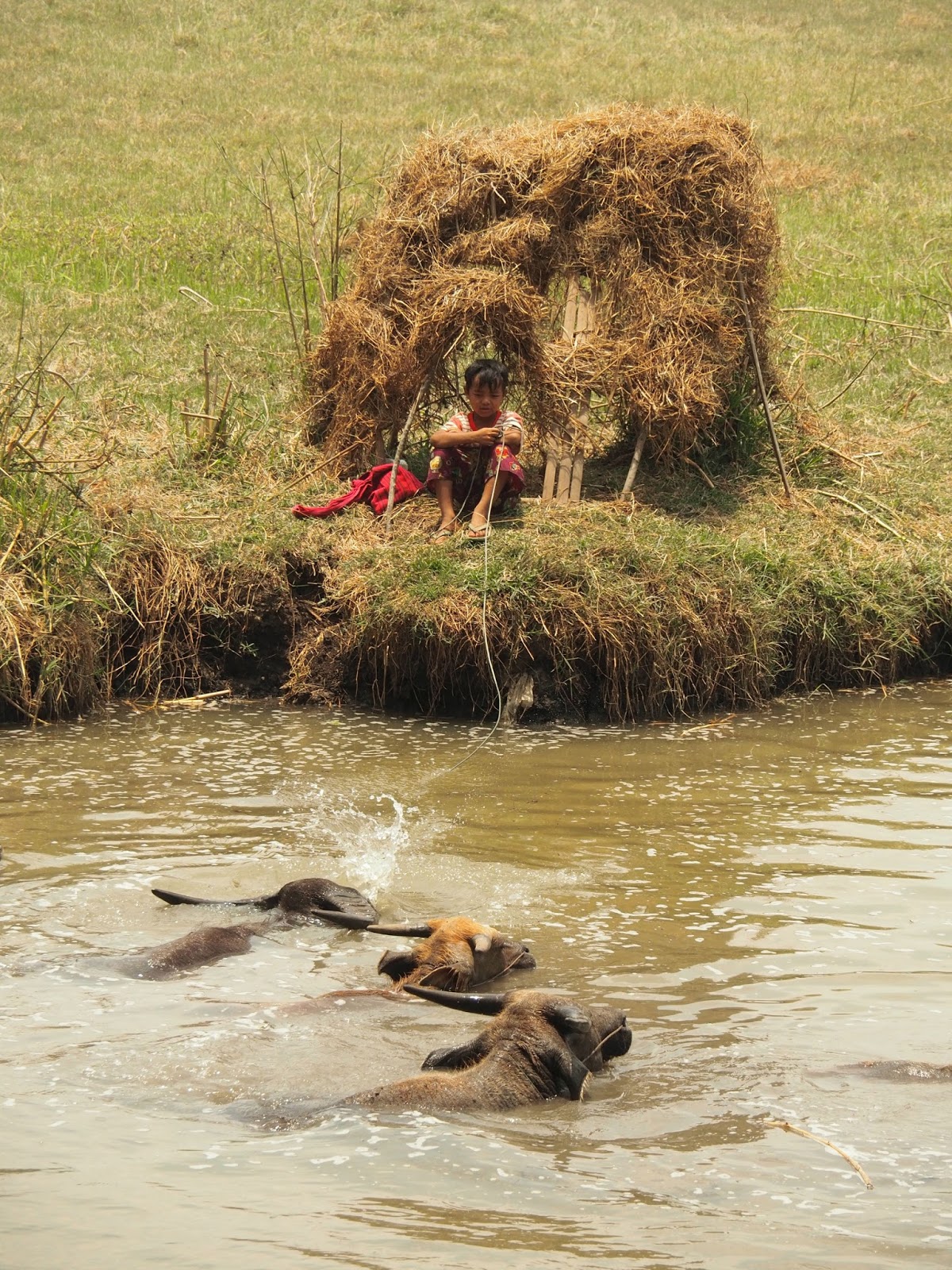 A child in charge of keeping an eye on the water buffalos bathing / Un enfant en charge de surveiller les buffles d'eau qui prennent leur bain